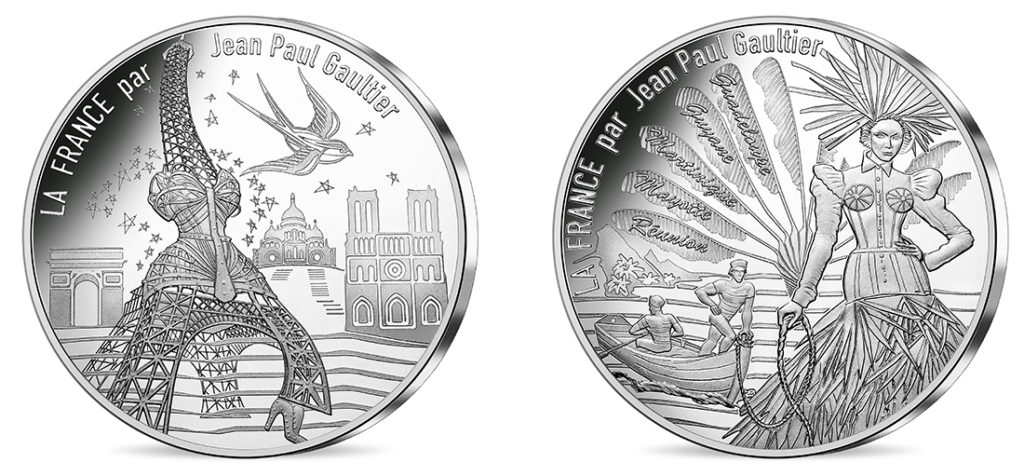 L’hirondelle dans le ciel en trisse de joie, tandis que Notre-Dame de Paris, le Sacré Coeur et l’Arc de Triomphe affichent leur façade emblématique de la capitale. La scène est coiffée du titre de la série, « LA FRANCE par Jean Paul Gaultier » rythmé par l’alliance de majuscules et de minuscules. Chacun des revers des pièces de 10€ argent présente le graphisme suivant : une branche de chêne et de laurier évoque le sigle de l’euro, tandis qu’une composition de traits représente l’Hexagone.